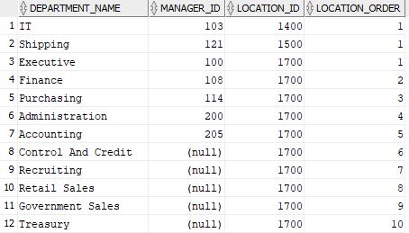 SELECT department_name,manager_id,location_id, ROW_NUMBER() OVER ( PARTITION BY location_id ORDER BY location_id ASC, manager_id ASC ) AS location_order FROM departments; |