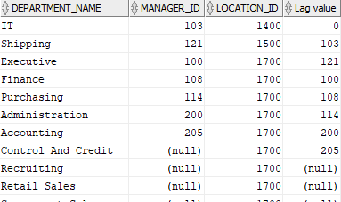 SELECT department_name, MANAGER_ID,LOCATION_ID, LAG(MANAGER_ID, 1, 0) OVER(ORDER BY LOCATION_ID, manager_id) AS "Lag value" FROM departments; |