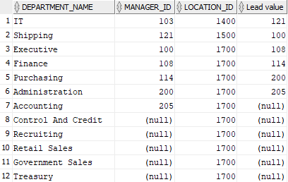 SELECT DEPARTMENT_NAME, MANAGER_ID,LOCATION_ID, LEAD(MANAGER_ID, 1, 0) OVER(ORDER BY LOCATION_ID, MANAGER_ID) AS "Lead value" FROM DEPARTMENTS; |